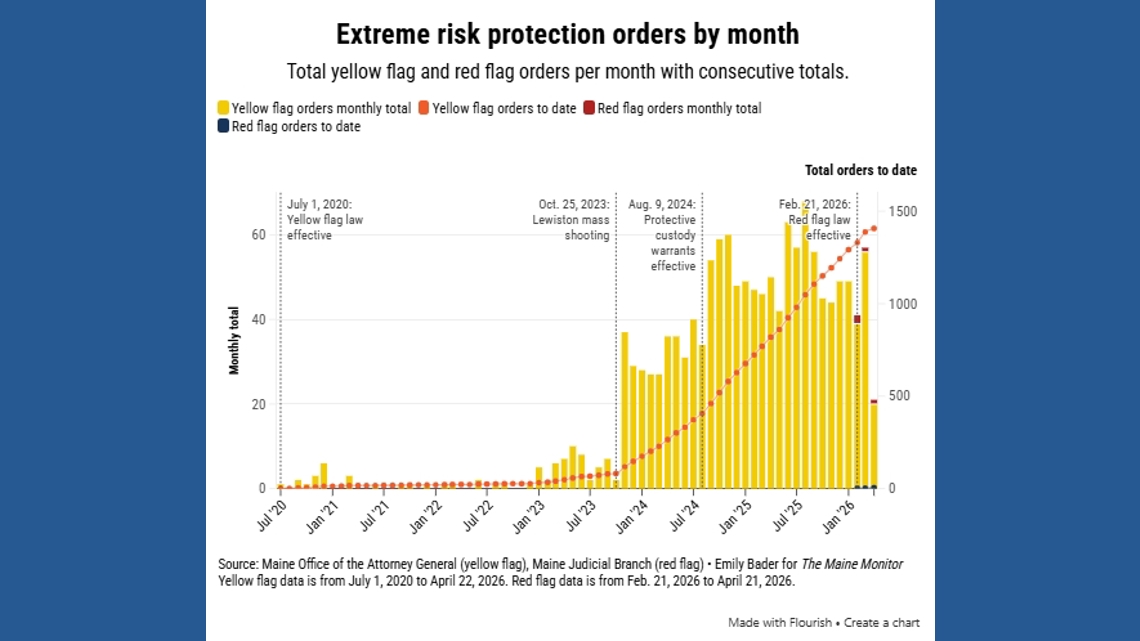 Namun dalam dua bulan sejak undang-undang tersebut berlaku, hanya empat petisi perintah bendera merah yang telah diajukan ke pengadilan Maine. Sementara itu, lembaga penegak hukum telah menyelesaikan 86 perintah bendera kuning, rata-rata satu perintah per hari sejak 21 Februari.