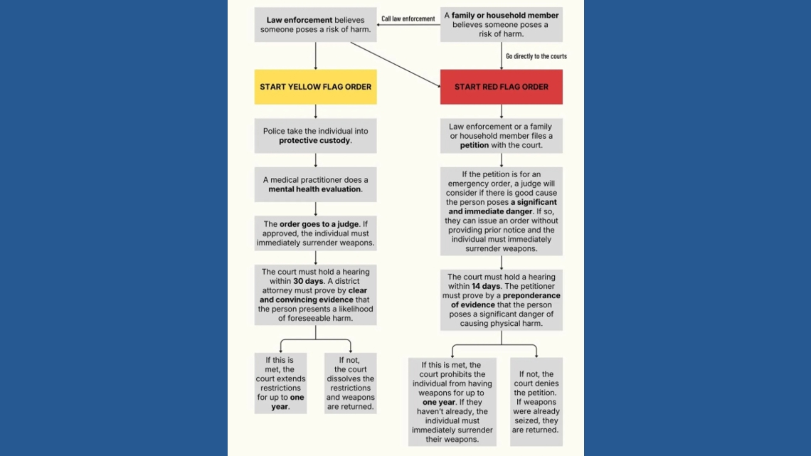 Kedua proses tersebut biasanya digunakan untuk mengeluarkan senjata dari orang yang ingin bunuh diri atau menimbulkan risiko membahayakan orang lain. Perintah bendera kuning harus dimulai oleh penegak hukum dan mengharuskan individu tersebut dimasukkan ke dalam tahanan pelindung dan diberikan evaluasi kesehatan mental, sementara perintah bendera merah juga dapat dimulai oleh anggota keluarga yang bersangkutan yang pergi langsung ke pengadilan, tanpa penilaian perilaku. Formulir bendera merah tersedia secara online atau secara langsung di gedung pengadilan.