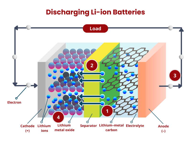 Saat Anda menyambungkan beban eksternal ke baterai, misalnya ponsel cerdas Anda, partikel bermuatan yang tersimpan mulai mengalir dari anoda melalui ponsel cerdas Anda dan kembali ke katoda baterai. Aliran elektron ini secara efektif memberi daya pada perangkat Anda.