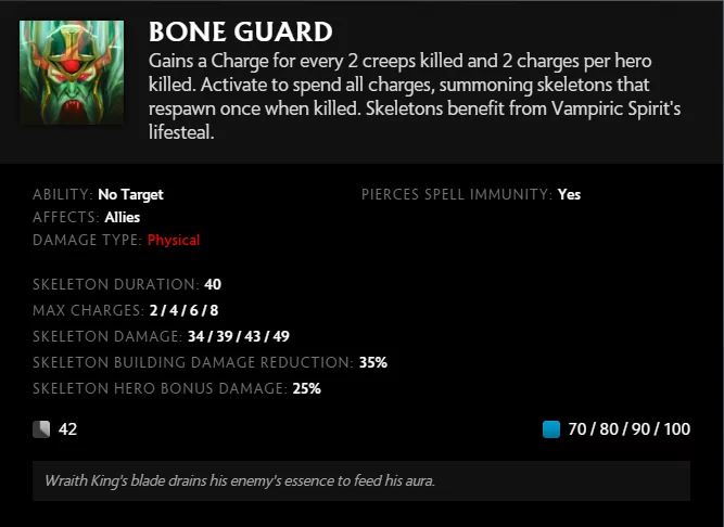 Setiap dua creep yang dia bunuh, Wraith King mendapat charge dari Bone Guard – dengan kata lain, satu skeleton. Pada level maksimal, dia dapat memiliki hingga delapan skeleton. Saat tidak ada cooldown, Wraith King dapat mengaktifkan mantra ini kapan saja untuk menggunakan semua serangannya saat ini, memanggil sejumlah skeleton. Jadi, semakin banyak charge yang kamu miliki, semakin banyak skeleton yang kamu panggil.