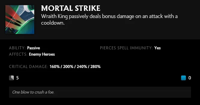 Berbeda dengan hero atau item lain yang critnya berdasarkan persentase peluang, Mortal Strike didasarkan pada cooldown. Ini berarti Wraith King dijamin akan mendapatkan kritikan jika Mortal Strike tidak ada cooldownnya.