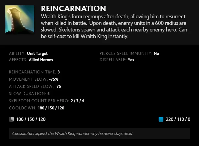 Kemampuan pamungkas Wraith King adalah Reinkarnasi. Seperti namanya, Wraith King mendapatkan nyawa kedua setelah mati, selama kemampuannya tidak dalam cooldown.