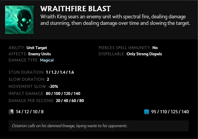Wraithfire Blast sangat sederhana. Wraith King meluncurkan proyektil ke unit musuh, yang memberikan damage dan membuat mereka stun saat terkena benturan. Selain stun, ia juga memberikan damage seiring waktu dan menerapkan gerakan lambat selama 2 detik.
